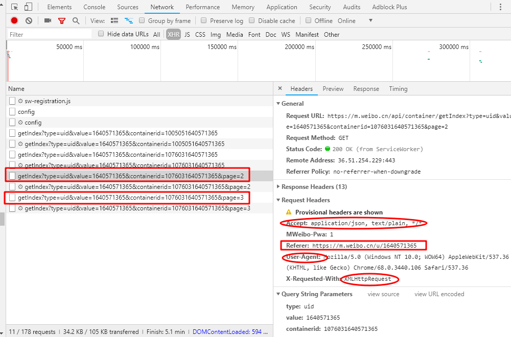 往后拖动页面的时候,会发现页面也在源源不断地加载,其中请求的URL中的参数基本不变,只有page代表页面在刷新,在请求头headers中,可以看到应用层传输的数据是json或者纯文本格式。
