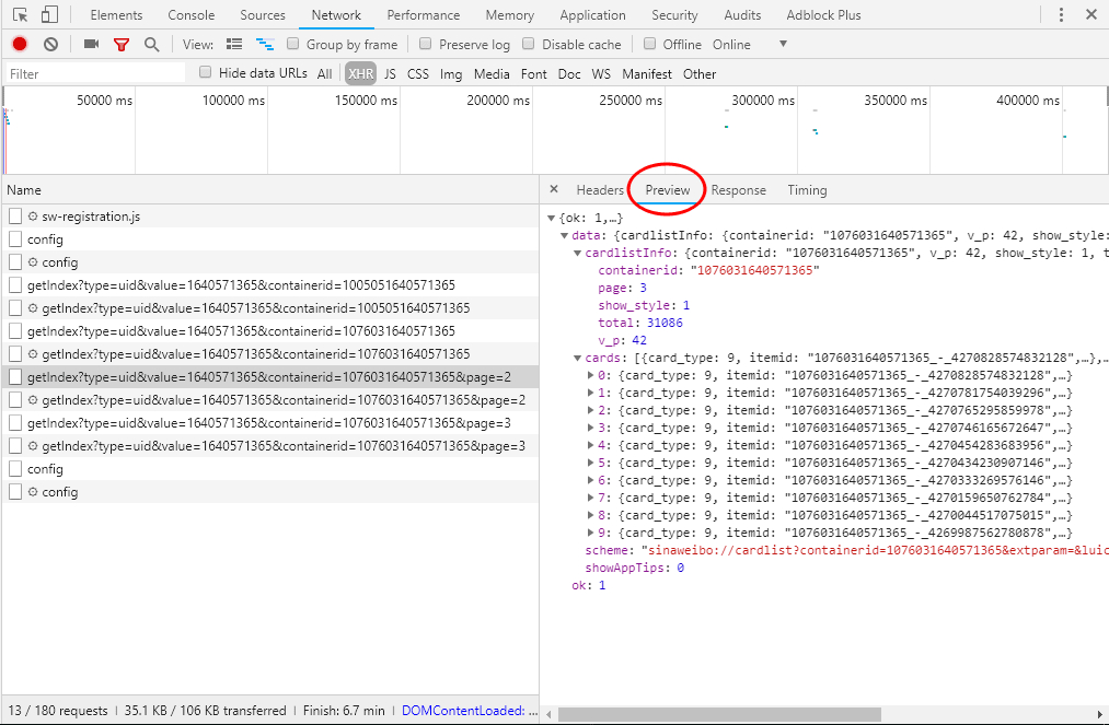 请求发出后,服务器会发回响应数据,在Response可以查看原始的服务器发回的数据,Preview是浏览器进行渲染处理后显示的便于观察的数据,可以看出返回的是json对象。