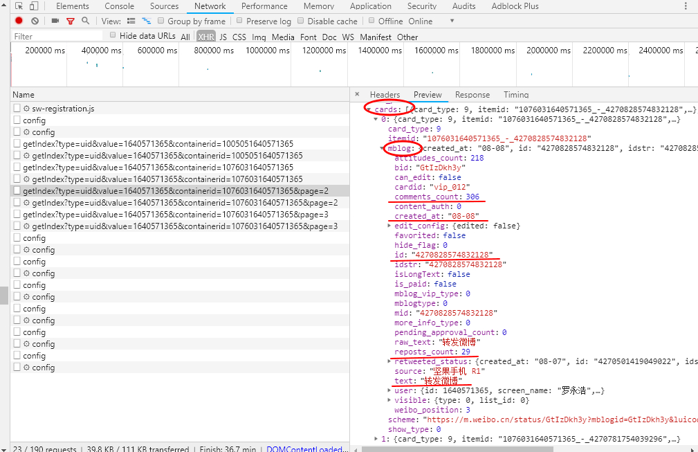 获取页面数据后,可以开始解析页面数据了,从上面截图中获取到cards字典中的数据,得到的会是一个列表list,需要通过迭代的方式来进行解析,如下图示我们解析每个列表中的评论数comments_count,创建时间created_at,id,转发数量reposts_count和微博内容text。