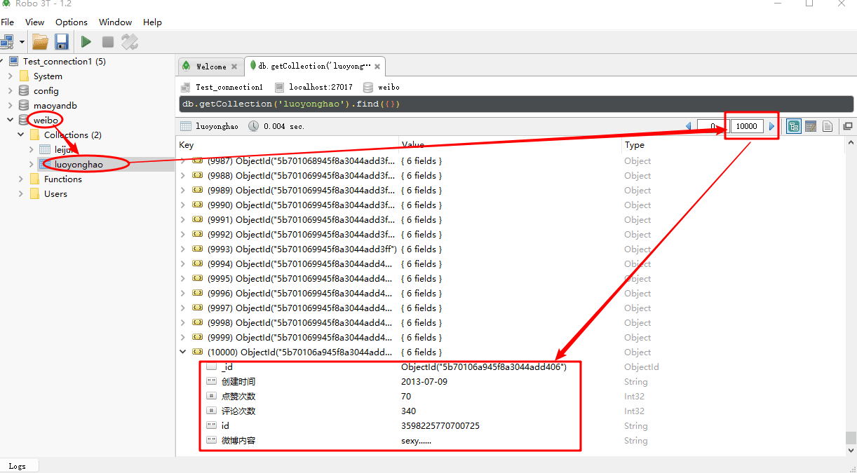 parse_page(content)运行程序,最终保存数据到MongoDB中,查看前10000条数据。